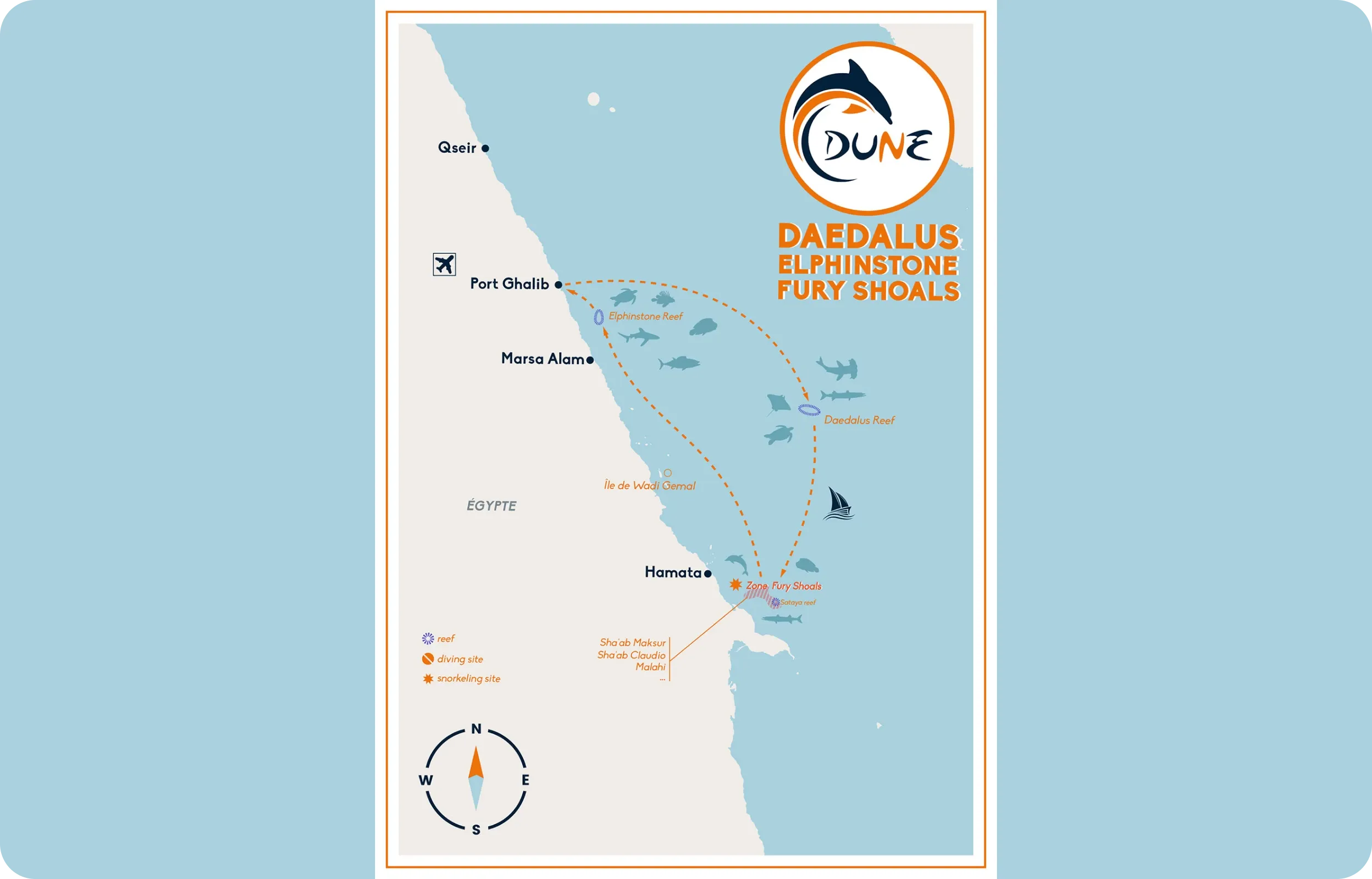Cette croisière plongée en Égypte réunit dans une même semaine trois zones fortes de la mer Rouge : Daedalus, Elphinstone et les Fury Shoals. L’itinéraire D.E.F. a été pensé pour les plongeurs qui veulent découvrir un large éventail d’ambiances sous-marines sans se limiter à un seul secteur. On y retrouve de grands tombants, des plateaux exposés, des jardins coralliens très vivants, des cavités peu profondes, quelques épaves et des zones propices aux belles rencontres pélagiques.