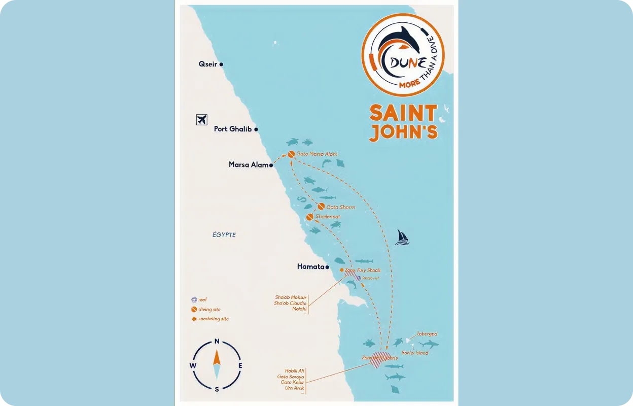 Sous l’eau, le voyage reste fidèle à la promesse des Jardins du Sud. Saint John’s Reef offre une grande diversité de récifs, entre jardins coralliens, sable blanc, cavités, tombants et reliefs très photogéniques. Le programme mentionne notamment Dolphin Reef, Shaab Manshur, Habili St John, Erg Gafer, Gota Soraya, Gota Kebir et Sirnaka, avec une logique d’exploration construite selon la météo et les conditions de mer. Les journées centrales permettent de profiter pleinement de la zone, avec une ambiance plus souple que sur d’autres croisières mer Rouge plus exposées, ce qui valorise la couleur, la lumière, la richesse corallienne et le plaisir de plongées répétées sur des sites très différents. La suite du voyage ajoute Sataya et les Fury Shoals, avec la possibilité d’un temps fort en PMT avec les dauphins à long bec.