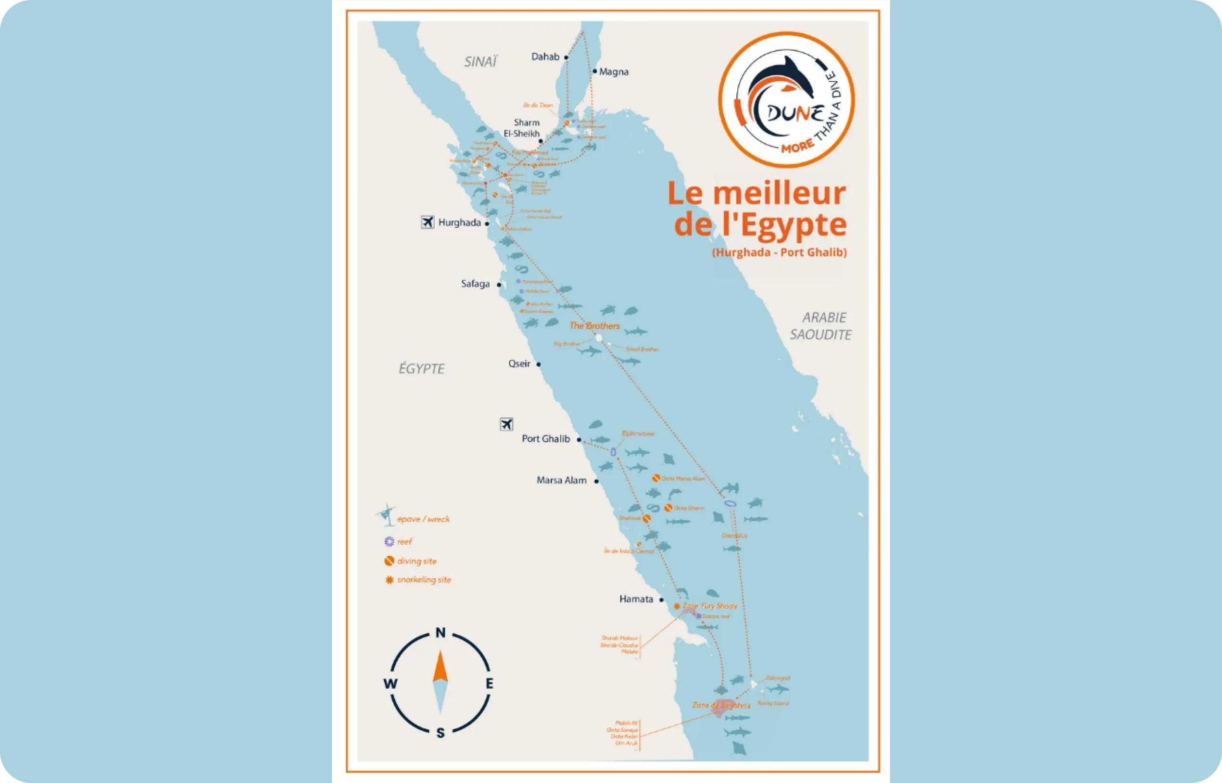 Une grande croisière plongée de 14 nuits pour relier les sites majeurs d’Égypte, des épaves mythiques du nord aux récifs du grand sud, avec 37 plongées et une forte diversité de paysages sous-marins.