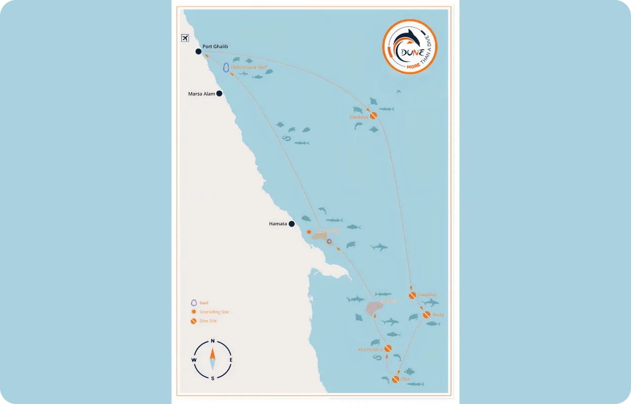 La croisière déroule un grand itinéraire sud entre plongée de réadaptation, Daedalus, Rocky, Zabargad, Elba, Abu Fendira, Saint John’s, Fury Shoals, Sataya, Elphinstone et la zone de Port Ghalib, avec 26 plongées annoncées et une vraie sensation d’exploration sur l’ensemble du voyage.