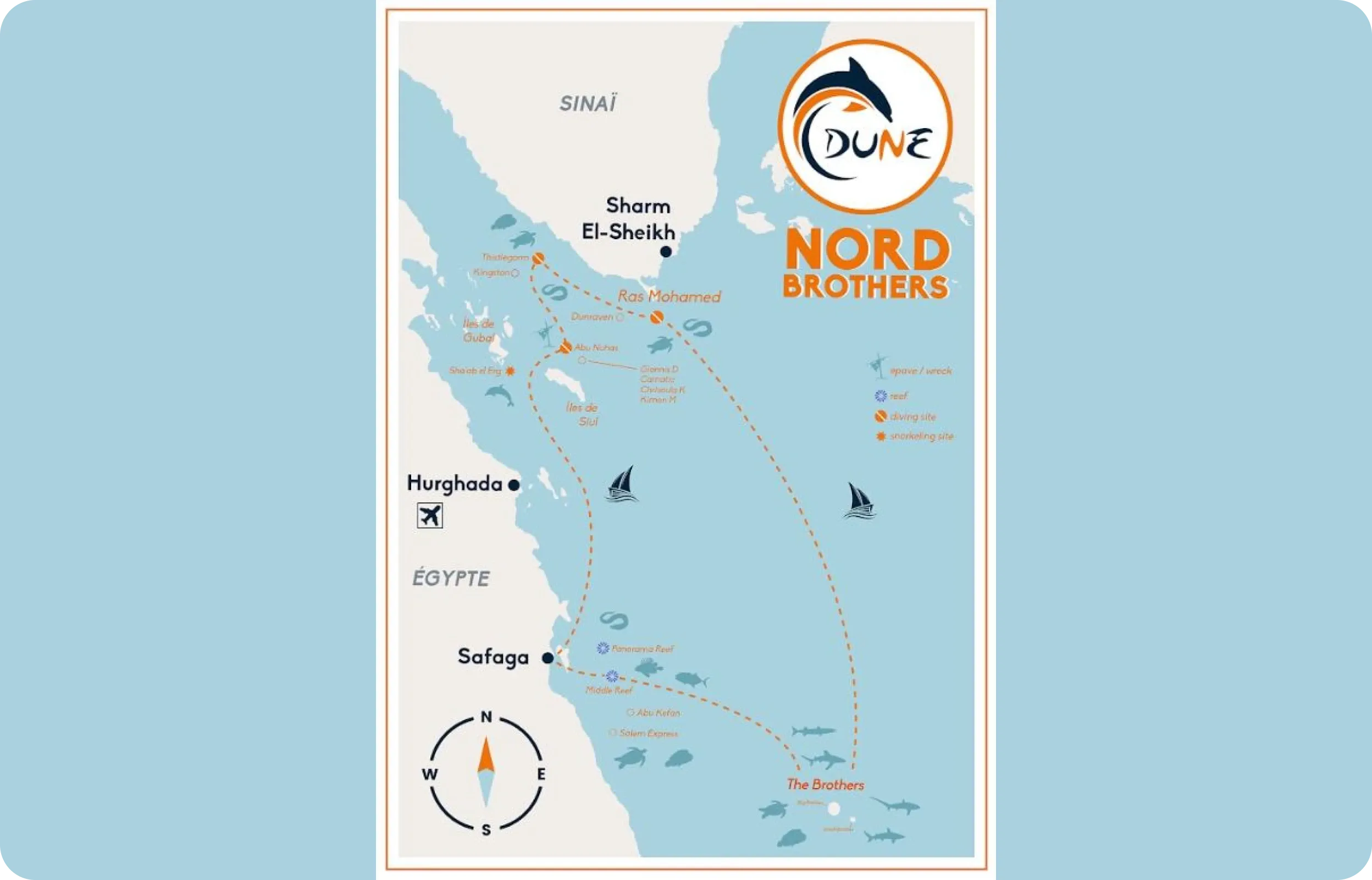 Cette croisière plongée en Égypte s’adresse aux plongeurs qui veulent réunir en une semaine les grandes signatures de la mer Rouge nord et une ouverture vers les Brothers. L’itinéraire Nord Brothers a été pensé pour combiner des univers très complémentaires : les épaves historiques du détroit de Gubal, les tombants coralliens de Ras Mohamed, le mythique Thistlegorm et l’ambiance plus hauturière des Brothers. Le résultat est une croisière très complète, avec un vrai rythme de plongée et une progression qui mêle sites faciles de réadaptation, épaves emblématiques, réserves marines et rencontres plus pélagiques.