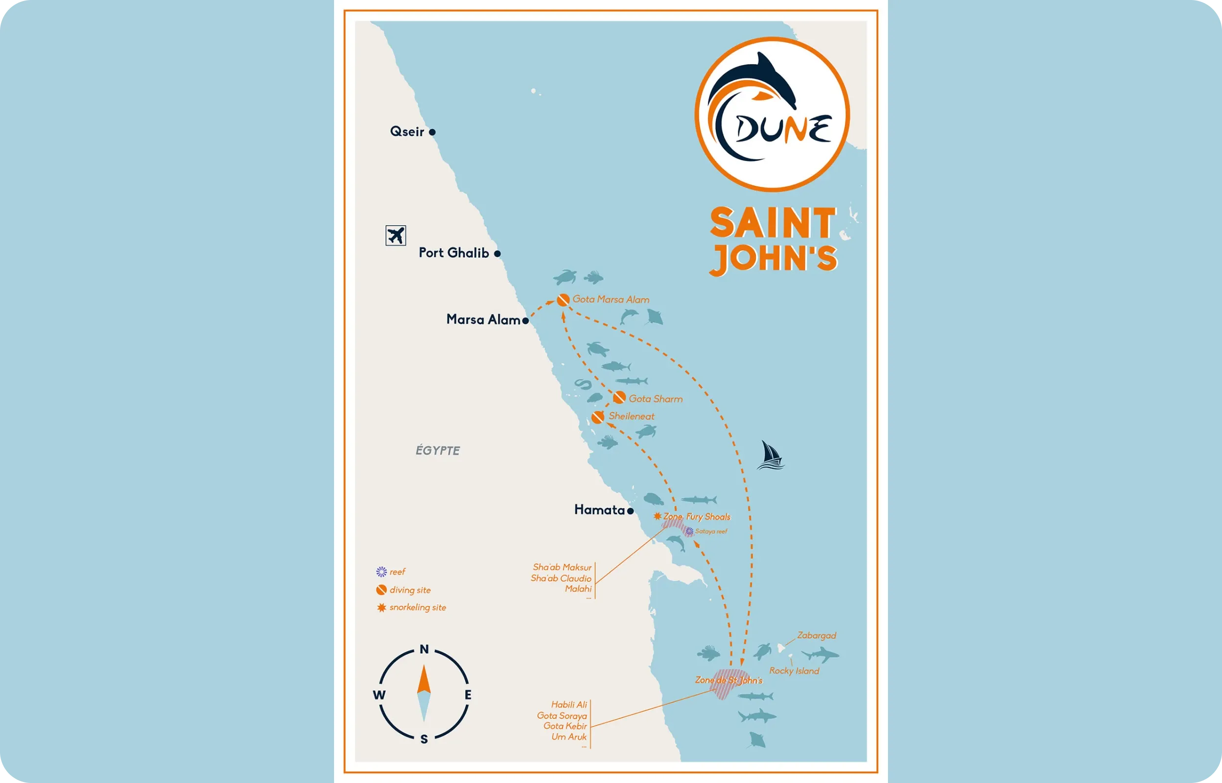 Cette croisière plongée en Égypte met le cap vers le grand sud de la mer Rouge, avec Saint John’s Reef comme fil conducteur. L’itinéraire s’adresse aux plongeurs qui cherchent une croisière riche en relief, en couleurs et en sensation d’évasion, loin des zones les plus fréquentées. Le voyage explore une zone étendue où se succèdent récifs isolés, tombants encore intacts, îles sous-marines, plateaux coralliens et passages lumineux. Sur la route, plusieurs secteurs peuvent être explorés selon les conditions, parmi lesquels Dolphin Reef, Shaab Manshur, Habila St John, Erg Gafer, Gota Soraya, Gota Kebir, Sirnaka et les grands ensembles de Saint John’s.