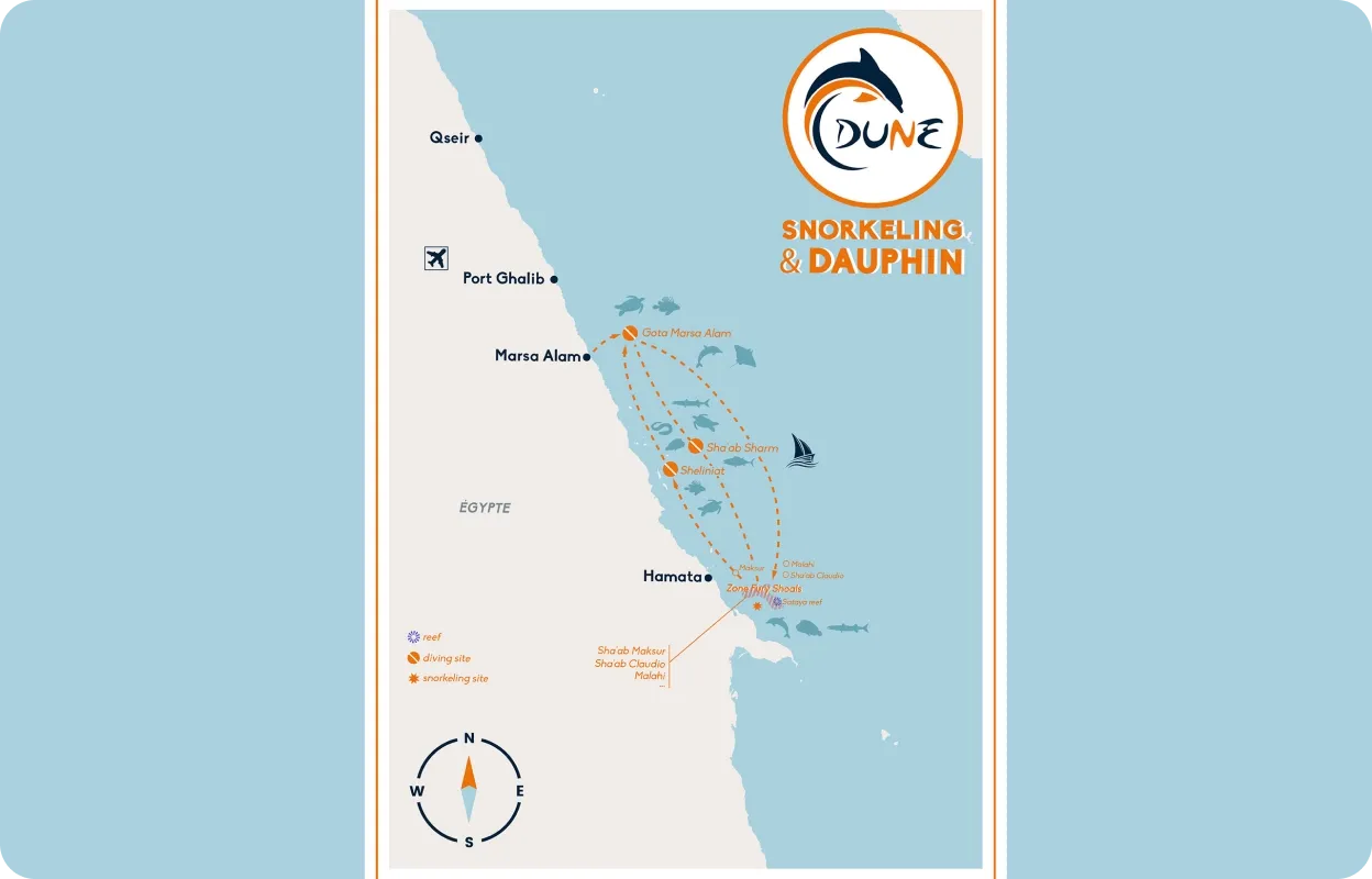 Après un briefing de début de séjour sur la sécurité et l’organisation, les premières activités débutent avec une immersion pour les plongeurs certifiés et du snorkeling le long des récifs. Les journées s’articulent ensuite entre temps en mer, activités accessibles à tous, navigation vers Fury Shoal et moments dédiés aux enfants, permettant aux parents de plonger en toute sérénité. Une initiation à la plongée est proposée pour découvrir l’activité en douceur, complétée par des sessions de snorkeling sur des récifs peu profonds et riches en biodiversité. Le programme inclut également des sorties d’observation des dauphins, réalisées dans le respect de leur environnement, avec une approche calme et non intrusive. Les derniers jours permettent de profiter une dernière fois des plongées et des sites comme Shaab Marsa Alam ou Abu Dabbab, avant un retour à Port Ghalib en fin de séjour.