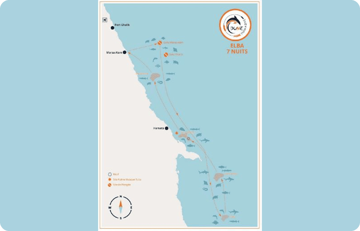 Cette croisière plongée Ultra Sud en Égypte s’adresse aux plongeurs qui veulent sortir des itinéraires les plus classiques pour explorer une zone plus confidentielle de la mer Rouge. Le voyage se déroule sur 7 nuits et 16 plongées, dans l’extrême sud égyptien, près de la limite avec le Soudan. Le cœur du programme se concentre autour du récif d’Elba, longtemps resté fermé, aujourd’hui accessible et réputé pour son caractère préservé. Cette zone s’inscrit dans une vaste réserve naturelle et séduit par la qualité de ses jardins de corail, ses grandes gorgones et l’ambiance encore sauvage de ses sites.