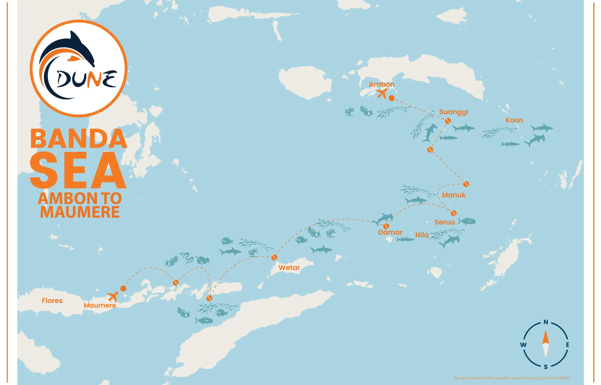 Le voyage enchaîne une arrivée à Jakarta, un vol intérieur vers Ambon, puis la séquence principale en mer de Banda avant le retour international. La page met en avant une croisière orientée exploration, avec plongées sur sites isolés, faune macro et pélagique, et ambiance route des épices.