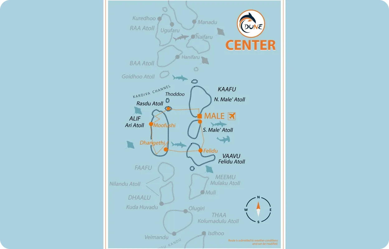 Une semaine immersive au cœur des plus beaux sites de l’archipel, entre récifs colorés, grottes, thilas spectaculaires et épaves riches en vie. Les plongées offrent de belles rencontres avec requins de récif, raies manta, tortues, barracudas ou encore poissons napoléon, avec la possibilité d’observer un requin-baleine. L’expérience est rythmée par des plongées de nuit, un dîner barbecue sur une île déserte et la découverte d’une île locale, pour une approche à la fois sauvage et culturelle de la destination.