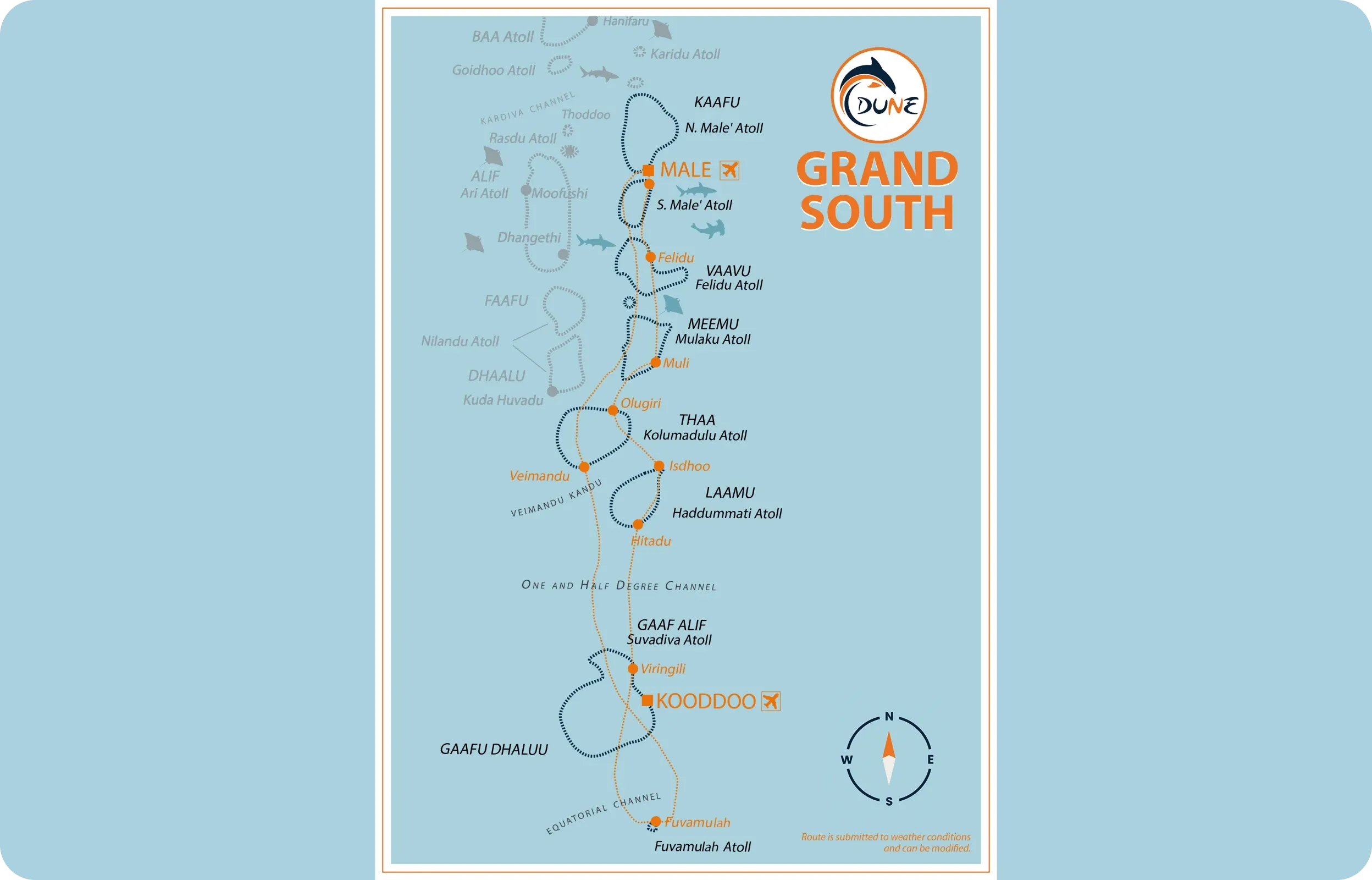 Cette croisière plongée aux Maldives suit un itinéraire Grand Sud pensé pour les plongeurs qui recherchent avant tout des plongées engagées, des passes vivantes et de vraies rencontres avec la grande faune. Sur 7 nuits et 16 plongées, le parcours relie Koodoo et Malé selon les départs, en traversant plusieurs atolls réputés pour leur caractère plus sauvage et préservé : Laamu, Thaa, Meemu, Felidhoo, Malé Sud et Malé Nord. Tout au long du voyage, l’intérêt majeur reste la diversité des ambiances sous-marines et l’intensité des observations possibles.