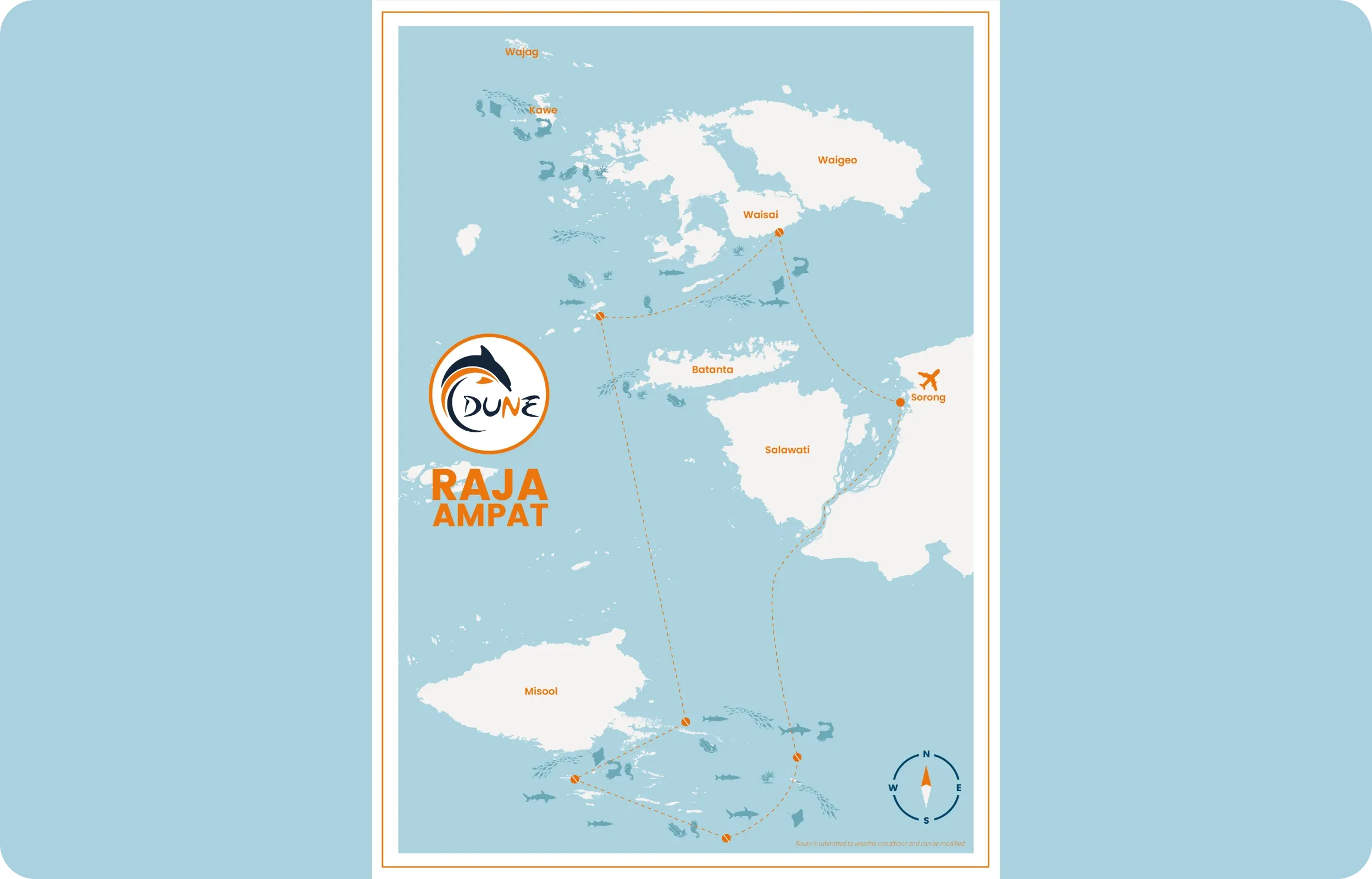 Cette croisière plongée en Indonésie à Raja Ampat Centre suit une route centrale courte mais très dense, pensée pour découvrir les secteurs les plus emblématiques de l’archipel sur 6 nuits et 15 plongées. Elle convient aux voyageurs qui veulent concentrer leur séjour sur le cœur de Raja Ampat, avec une alternance de sites réputés pour leurs récifs intacts, leurs grandes concentrations de poissons et leurs paysages de surface spectaculaires. Le programme démarre avec une navigation vers Waigeo, puis se concentre sur le détroit de Dampier, l’une des zones les plus connues de Raja Ampat. On y retrouve des sites majeurs comme Mioskon, Blue Magic ou Sardines, connus pour leurs coraux préservés, leurs courants nourriciers et l’abondance de vie sous-marine. Cette partie du voyage permet de profiter d’une ambiance très représentative de Raja Ampat Centre, avec des plongées riches, colorées et souvent très animées.