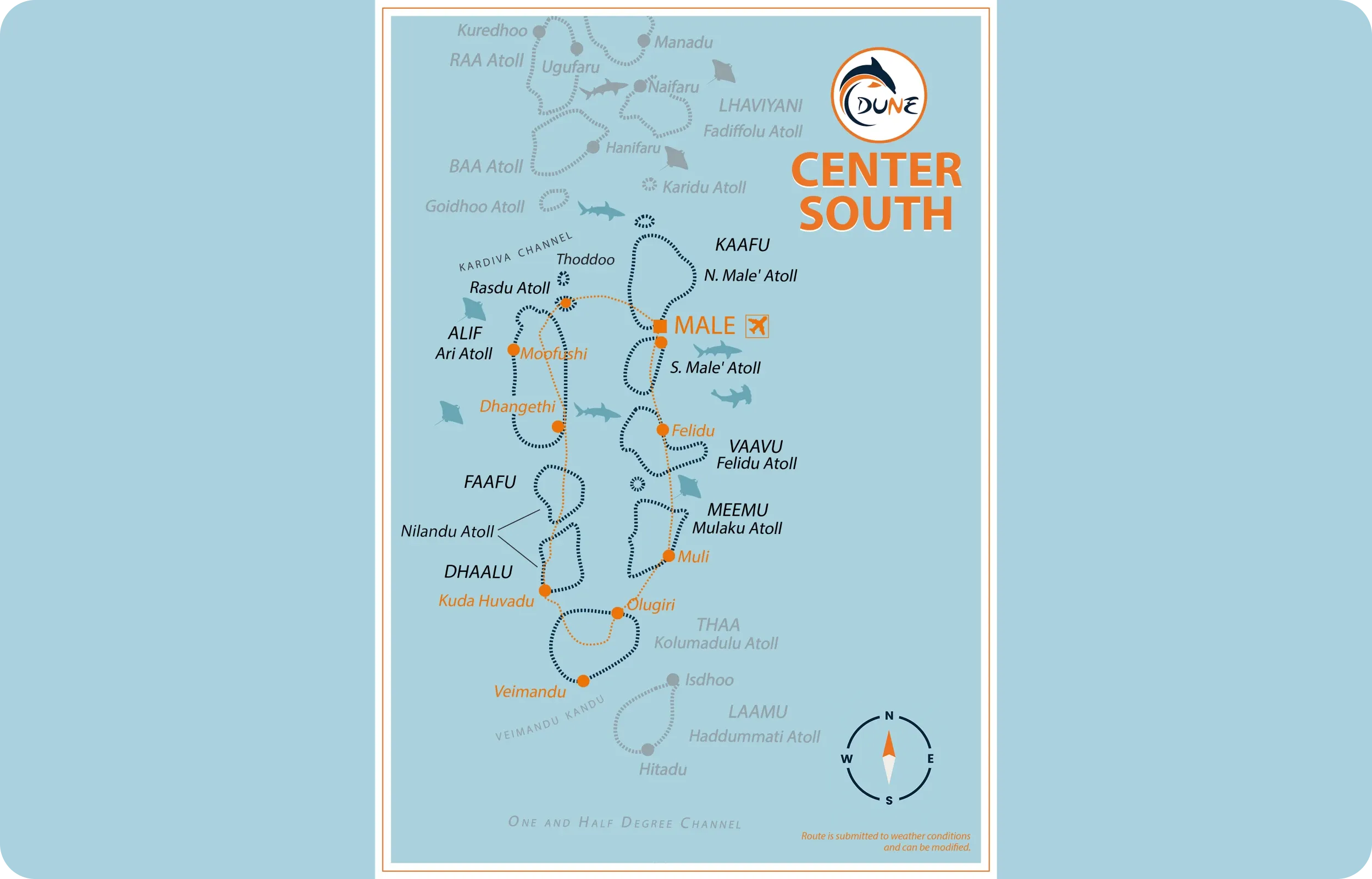 Grande séquence de croisière au cœur des atolls centre et sud, avec exploration de récifs, thilas, grottes, épaves et plongées de jour ou de nuit, complétée par des temps forts hors plongée comme un barbecue sur une île déserte et la visite d’une île locale.