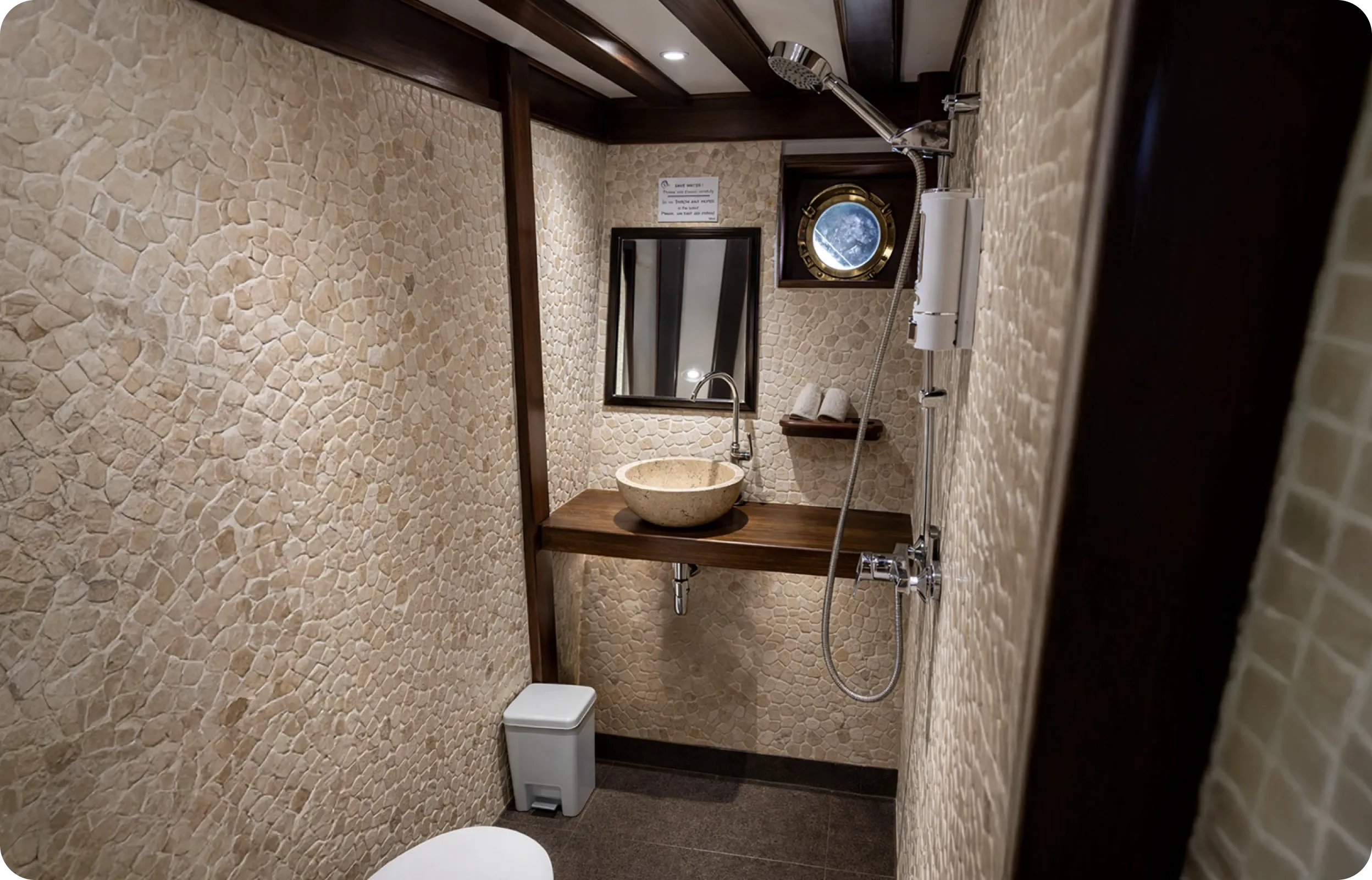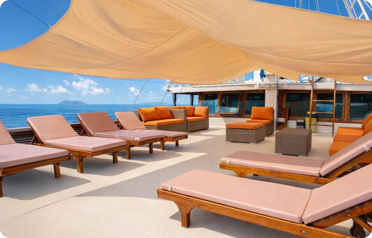 À l’extérieur, le pont soleil invite à ralentir le rythme, admirer les paysages de l’archipel et savourer les fins de journée en mer. Un espace idéal pour prolonger l’expérience entre détente, horizon et lumière indonésienne.