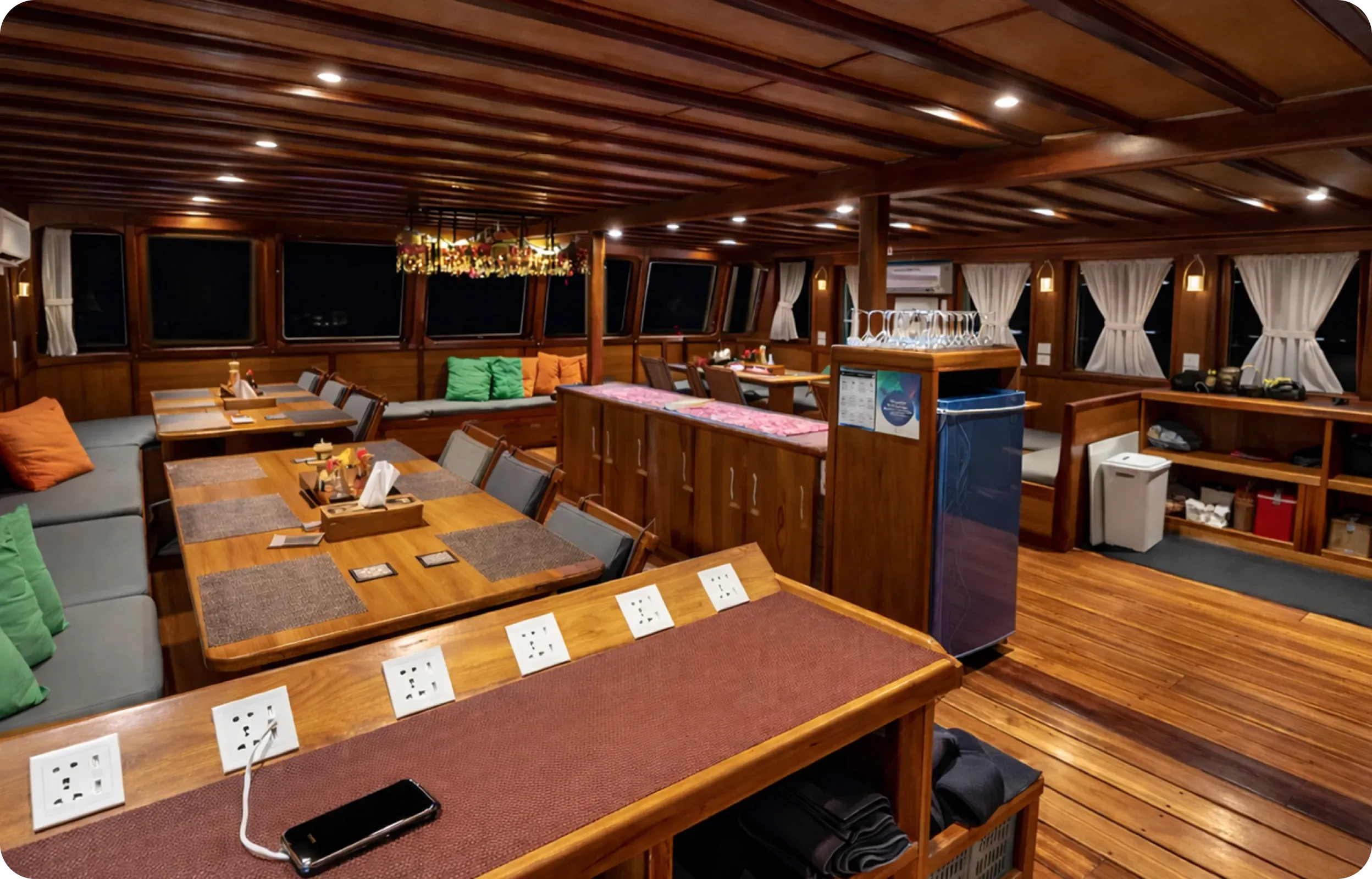 Pensés pour les temps calmes comme pour les moments de partage, les espaces communs permettent de se retrouver, d’échanger après les plongées et de profiter pleinement de la navigation dans une atmosphère conviviale. Le salon climatisé apporte un vrai confort tout au long de la croisière.