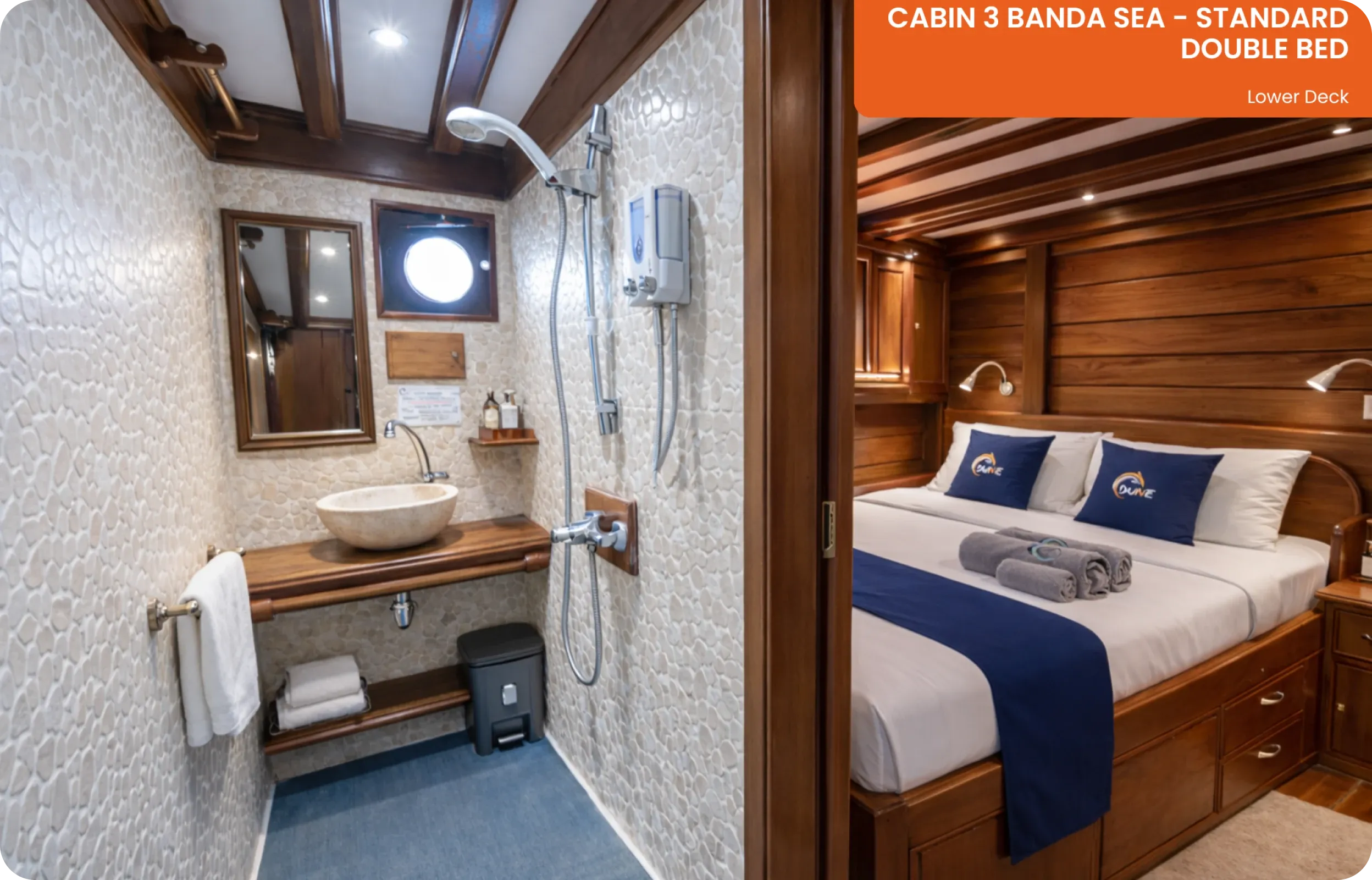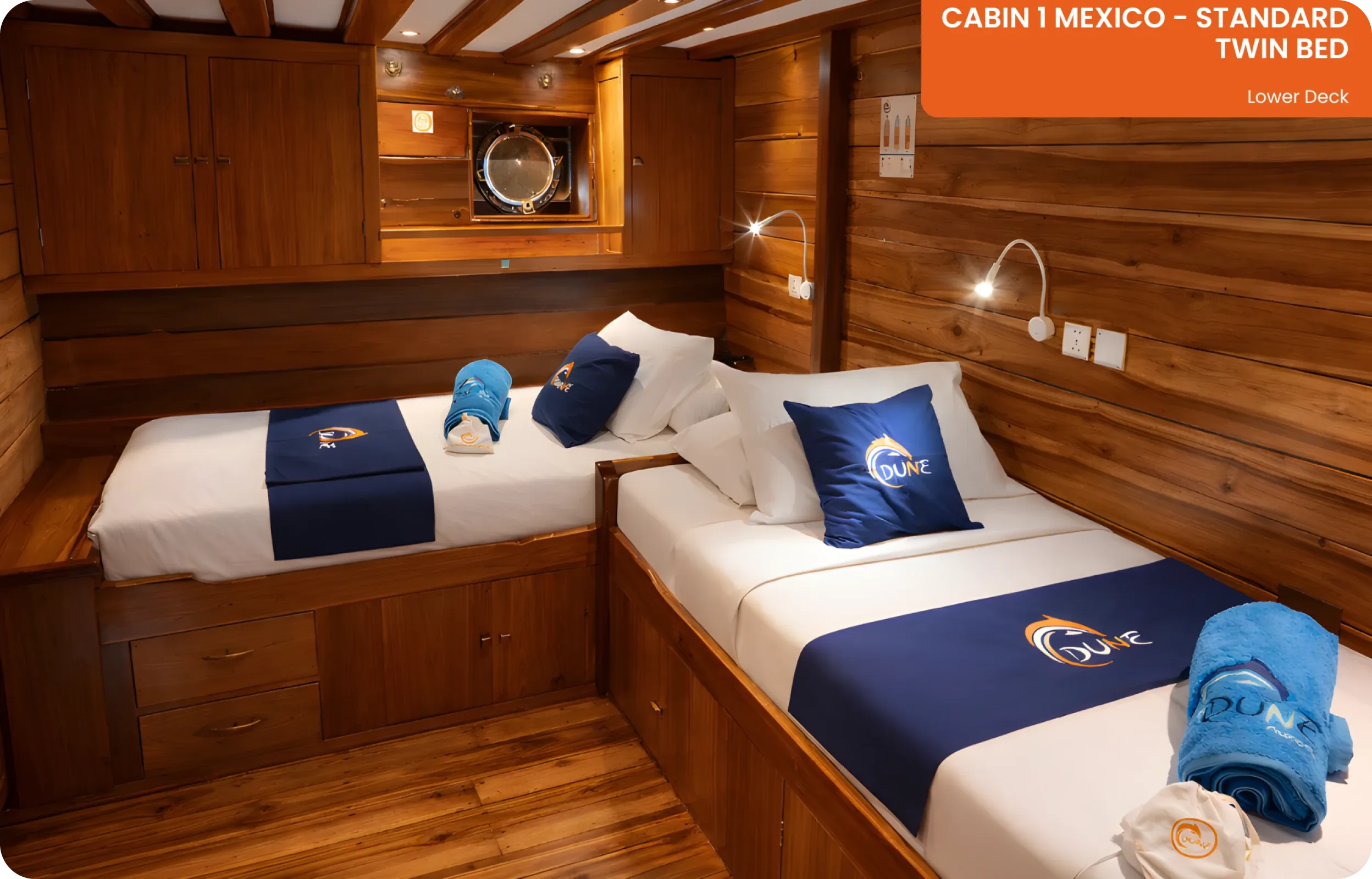 Les 9 cabines doubles ou twin de l’Aurora offrent un cadre confortable pour se reposer entre deux journées en mer. Toutes disposent d’une salle de bain privative, de la climatisation et d’un service de ménage quotidien pour garantir un séjour fluide et agréable.