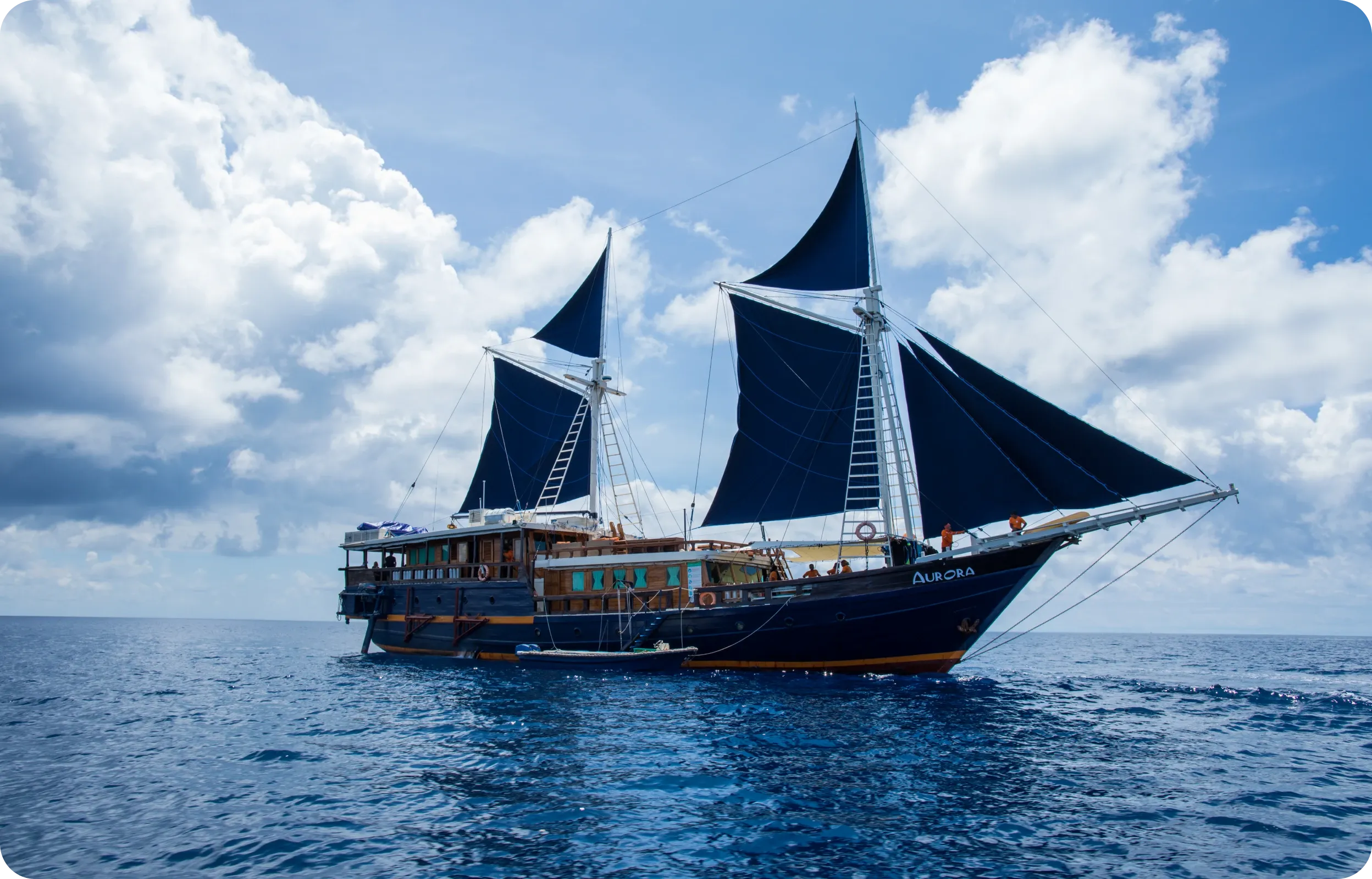 Le Aurora, un navire Pinisi de 42 mètres construit à Sulawesi, allie modernité et charme traditionnel. Il propose 9 cabines doubles ou jumelles avec salles de bains privatives, climatisation et ménage quotidien, pour accueillir jusqu’à 21 invités. L’équipage amical veille au confort de nos hôtes durant leurs voyages.