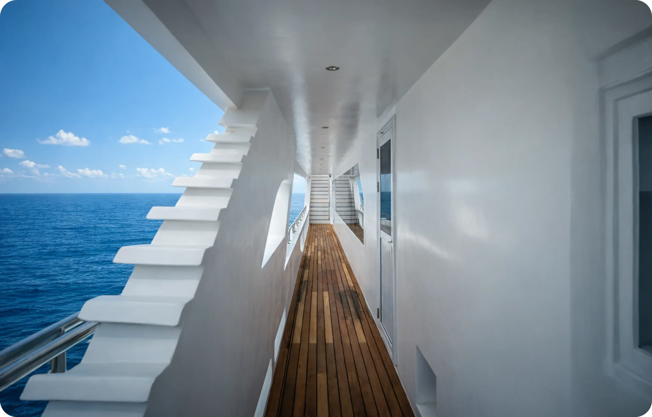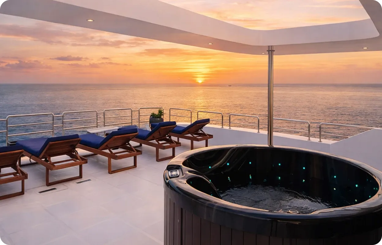 Le pont extérieur est conçu comme un vrai lieu de vie : zone de détente, bains de soleil, espace massage et jacuzzi permettent de profiter pleinement de la navigation, de la lumière et des panoramas des Maldives.
