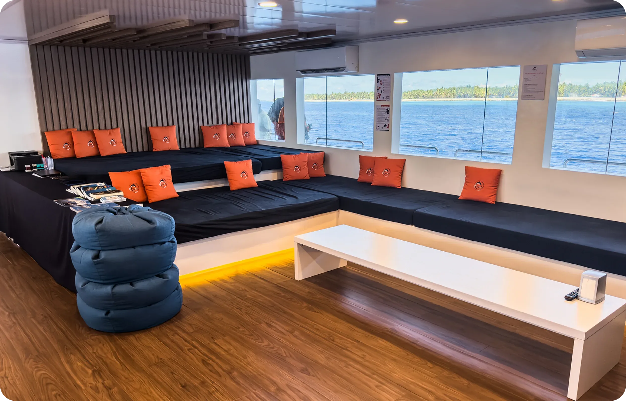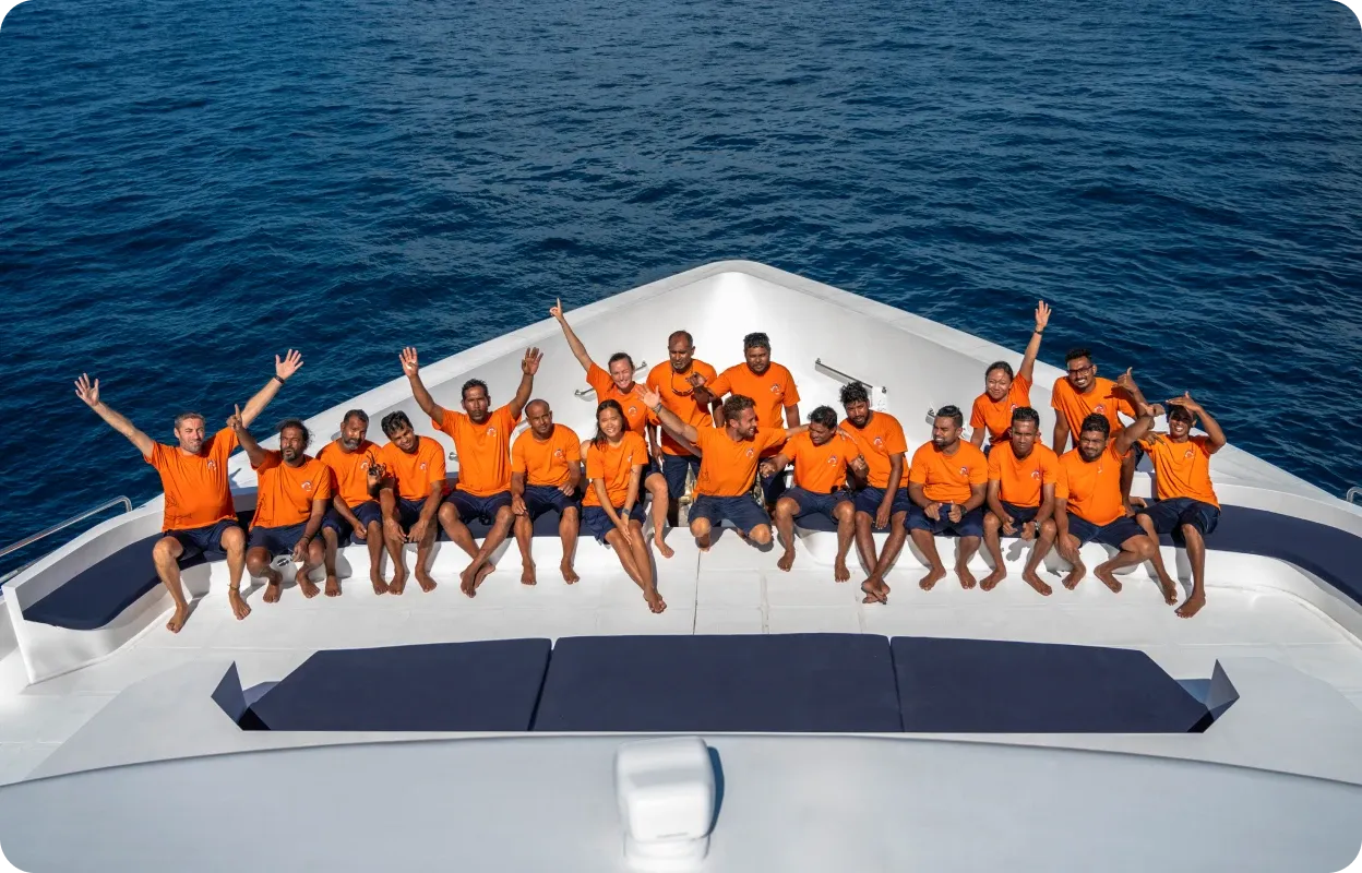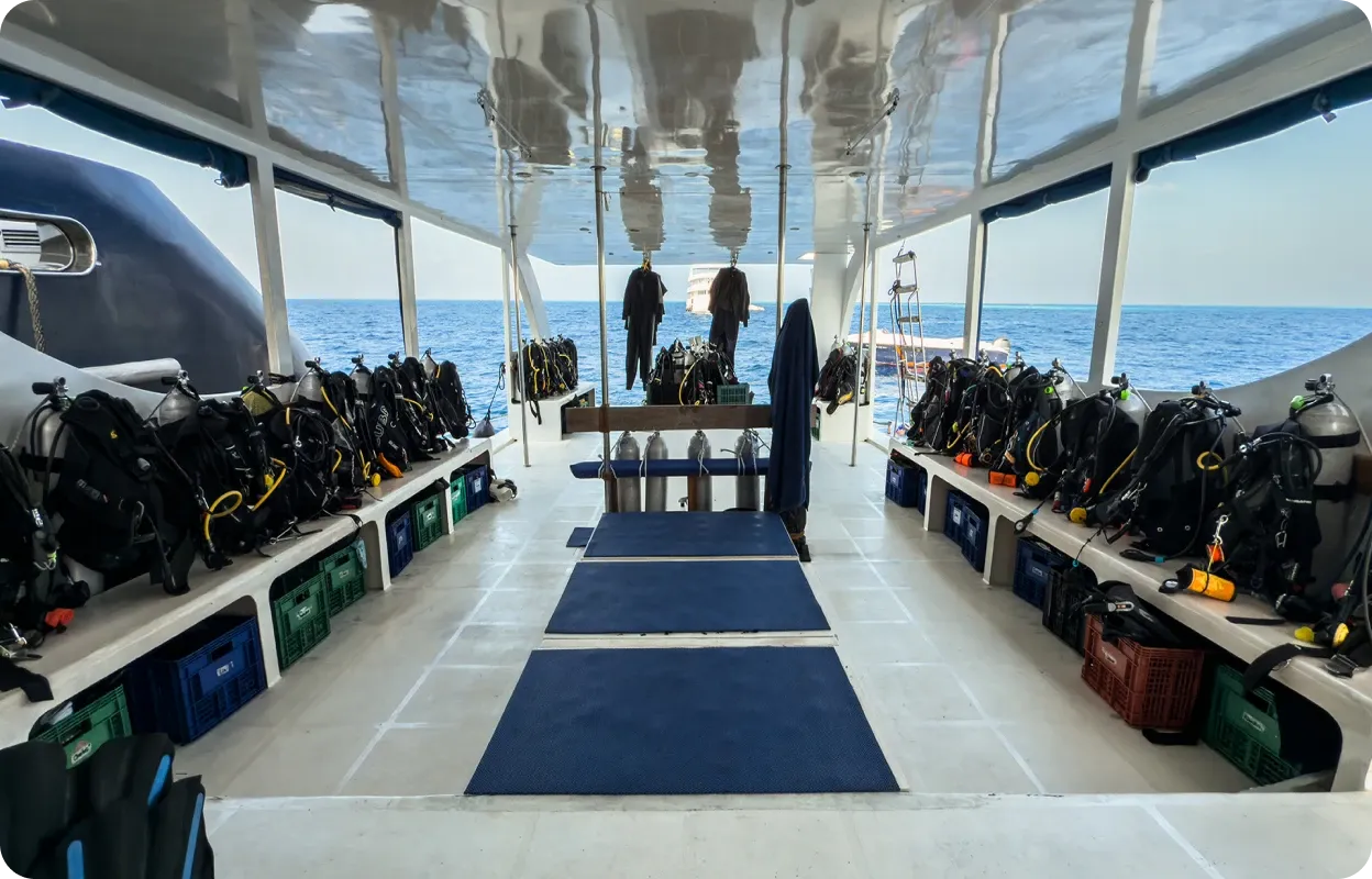 Entre les plongées, les voyageurs profitent d’un salon intérieur climatisé, d’un espace convivial pour se retrouver, d’un coin cocktail, d’une station dédiée au matériel photo et d’un espace repas en plein air ouvert sur les paysages maldiviens.